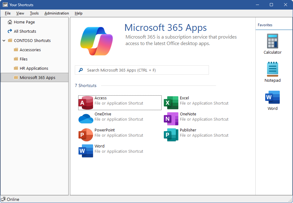 The favorites panel displays shortcuts that have been configured as a favorite by a system administrator within the shortcut settings and to which the user has permissions.